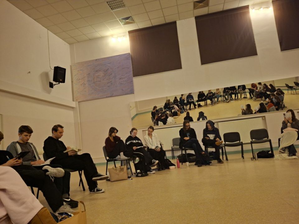 W noc listopadową z piątku na sobotę (22/23 XI 20204) w auli gdyńskiej Trójki, w ramach przygotowań do egzaminu dojrzałości z języka polskiego, kilkudziesięcioosobowa grupa uczennic i uczniów z klas maturalnych uczestniczyła w performatywnym czytaniu „Dziadów” Adama Mickiewicza.
