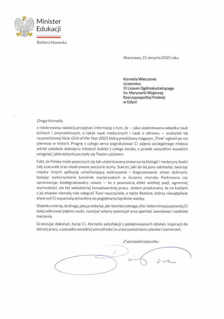 Aktualności Szkoła IBO 5 września 2025 Bozena Chmielinska O sukcesie naszej uczennicy – Kornelii Wieczorek pisaliśmy z wielką dumą we wcześniejszym artykule. Tym razem publikujemy List gratulacyjny przesłany Z Ministerstwa Edukacji Narodowej. Poprzedni wpis Kornelia Wieczorek na pierwszej w historii liście Girls of the Year 2025 magazynu TIME Następny wpis Ogromny sukces olimpijski matematyka z gdyńskiej Trójki