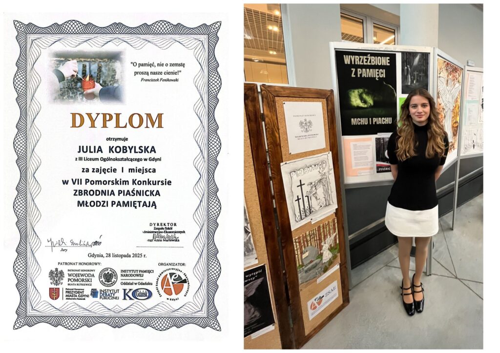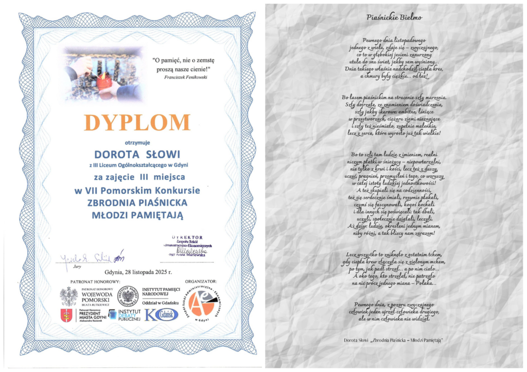 Wśród wyłonionych z 27 szkół województwa pomorskiego nagrodzonych osób, które w swoich pracach poetyckich i artystycznych podjęły trudną tematykę martyrologii piaśnickiej, znalazły się dwie uczennice naszej szkoły: Julia Kobylska (klasa IV IB) i Dorota Słowi (III H).