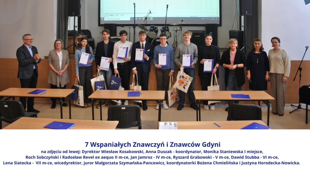 Spośród wyłonionych w szkole „SIEDMIU WSPANIAŁYCH ZNAWCÓW I ZNAWCZYŃ GDYNI” najlepsza okazała się Monika Staniewska z klasy 1C. Miejsce II ex aequo zdobyli Roch Sobczyński (klasa 4E) i Radosław Revel (klasa 2Z).