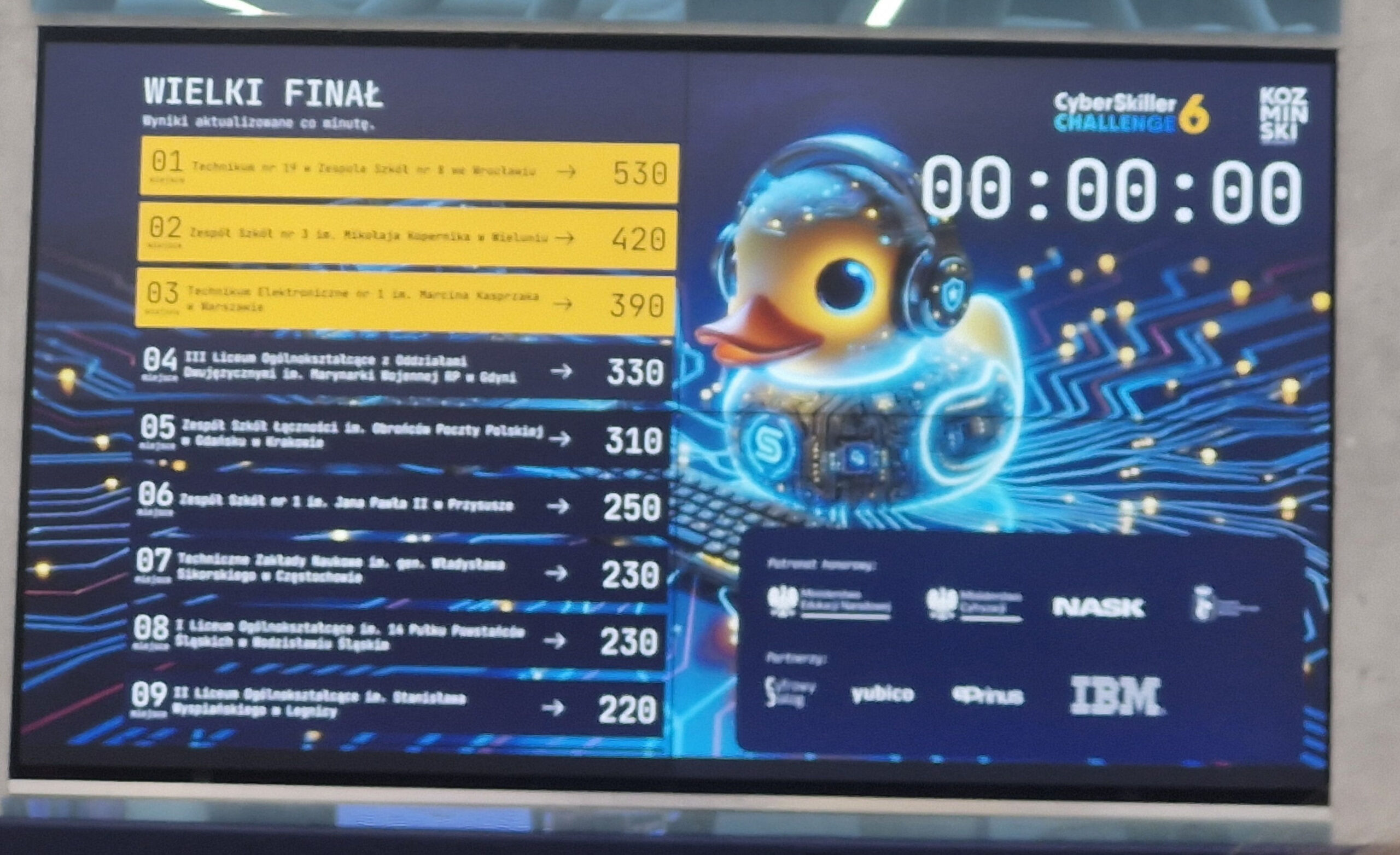 We wtorek 14.04.2026 zakończył się 6 finał największego ogólnopolskiego Konkursu Informatycznego CyberSkiller Challenge 6 organizowany na Akademii im. Leona Koźmińskiego w Warszawie. Wystartowało w nim 208 szkół i 2049 uczestników. Zespół III LO w Gdyni w składzie Piotr Guziński, Tomasz Kuraczyk i Oliwier Wiśniewski zajęli I miejsce w Polsce w kategorii liceów i 4 miejsce w kategorii open.