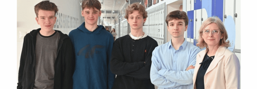 (na zdjęciu od lewej) Franciszka Czaplewskiego, Piotra Wesołowskiego i Antoniego Nowosielskiego, który ma już na koncie złoty medal XIX Środkowoeuropejskiej Olimpiady Matematycznej (zdobyty w Niemczech w 2025) i został powołany do reprezentacji Polski na (światową) Międzynarodową Olimpiadę Matematyczną w Szanghaju w 2026.